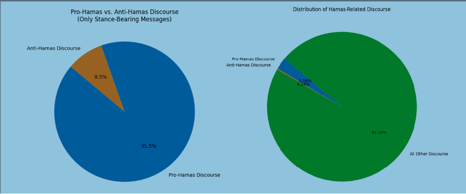 Pro-Hamas messages accounted for approximately 2.6 percent of the dataset, while explicitly anti-Hamas messages came in low at .024 percent, consistent with weeks prior. That raises fears that Gazans could be reducing, softening, and quieting their anti-Hamas statements, meaning that a window of opportunity to voice and spotlight these perspectives may be closing. Additionally, the overall low amount of discussion about Hamas indicates that the group’s role in shaping broader sentiments is limited, if not negligible.