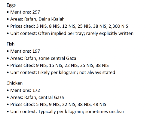 Many of the market concerns remain the same week over week: constrained liquidity, limited market access in the north, and little visible aid in northern zones, as well as insufficient aid reported in central and southern zones relative to actual demand. Prices of basic goods continue to vary widely across the Strip. For example, a tray of eggs can be reported to cost as little as 3 Israeli new shekels (NIS), or about one dollar, in some zones and 38 NIS in others, while items like chicken are only referenced in messages from central Gaza, with a range of 5 NIS to 40 NIS. Even tents have price variation, with this week’s analysis of over one thousand messages showing prices ranging anywhere from 40 NIS to 3,000 NIS in the Rafah and Khan Younis areas.