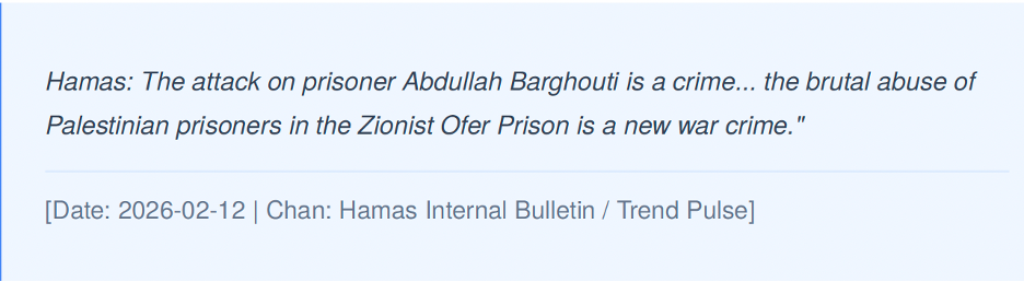 Pro-regime Hamas channels amplified coordinated messaging efforts this week. One focal point was the status of prisoners, particularly the reported beating of a Hamas official in Israeli custody. Pro-Hamas accounts framed the incident as evidence of intentional abuse, starvation, medical neglect, and systemic targeting of prisoners. The incident was repeatedly described as a “war crime,” reinforcing broader accusations against Israeli authorities.