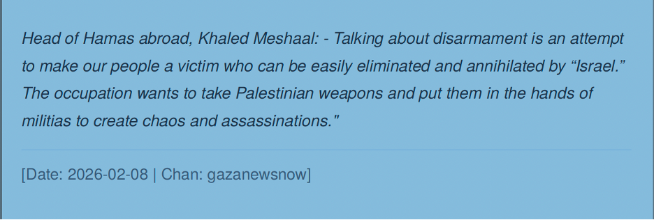 Simultaneously, Hamas leadership circulated high-level statements rejecting disarmament. This coordinated messaging discredited claims from the United States and others regarding potential disarmament agreements. Within this discourse, disarmament is equated with permanent subjugation. For example, Khaled Meshaal, the head of Hamas’s diaspora office, framed disarmament as rendering Palestinians defenseless and vulnerable to elimination. By linking prison-abuse imagery with arguments against disarmament, Hamas-supporting channels create a narrative that positions arms as the sole deterrent against unchecked Israeli violence.